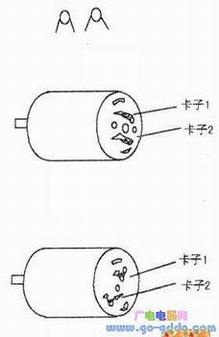 用一个圆珠笔芯的弹簧,也可用两个小别针,做两个的小卡子(见上图),在撬开电机的后盖固定槽后,将两个小卡子分别卡在两个弧型开口内(见中图);如果弧型开口过小,也可卡在弧型口和它附近的圆孔内(见下图)。由于卡子有弹性,取下后盖卡子也不会掉下,而两个电刷在卡子的弹力作用下,始终保持最大张开的位置,电机修复后把卡子拔下,使电刷恢复原位即可。