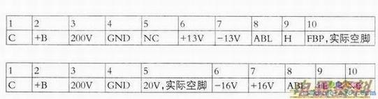 以上是根据印刷上行输出变压器的引脚标注记录的。根据实际测试的数据,+B有的标注为130V,实际电压为145V;+13V、-13V的电压实际为+16V、-16V。有的⑥脚为正电压,⑦脚为负电压,有的⑥脚为负电压,⑦脚为正电压,给场扫描集成块供电。实际维修时可以把两脚进行交换,得到所需要的电压值。