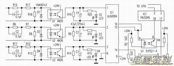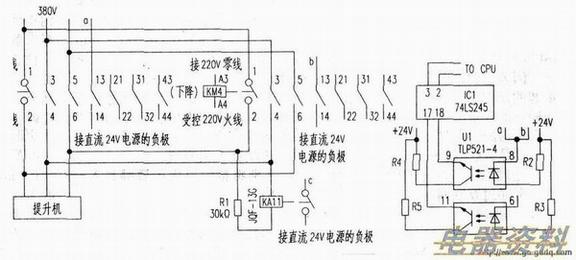 采用降压,光耦反馈信号。当KM3线圈得电后.220V电压经Cl (O.lμF)降压、R2与R3分压、Dl整流、光耦Ul (4N26)导通,经电容C4(47μF/25V),得到平滑的电压加到l (ULN2004)的(1)脚。桐对应的(16)脚变为低电平,R19为泄放,光耦TLP521-4的(8)脚变为低电平,内部的发光二极管导通,(9)脚输出高电平,通过74LS245(八同相三态总线收发器)处理后送入槽控箱的CPU.CPU作出正确判断,提升机加电正常。其他两路的工作原理同上。