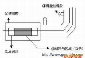 说干就干,我根据所断电路的长短,剪一断细铜丝,用胶布粘在断路处。要注意,由于电路太细太密,铜丝之间千万要注意不能联在一起,另外铜丝要比断路的电路两端之间的距离稍长一些,以保证两端的铜丝与线路良好地接触,再有胶布不能粘在键盘按键的地方。(见图)我干完后,按原样装好键盘,开机试用,一切正常。键盘修复到此完成。修的键盘到现在还无任何不良反应。