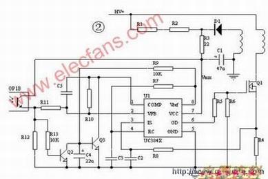 用UC3842做的的典型见图1.过载和短路保护,一般是通过在开关管的源极串一个(R4),把信号送到3842的第3脚来实现保护。当过载时,3842保护动作,使占空比减小,输出降低,3842的供电电压Vaux也跟着降低,当低到3842不能工作时,整个电路关闭,然后靠R1、R2开始下一次启动过程.这被称为“打嗝”式(hiup)保护。