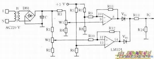 下图故障检修过程如下。由于该电路增加了比较放大元件,所以与上述过欠压电路检修有所区别,检修时可测LM324管脚电压,判断过欠压电路是否正常。当电源电压正常时,如测量欠压电路LM324的8脚为低,说明欠压电路正常;如测量为高电平,说明欠压电路有故障。检修时可通过调整电位器Wl使其输出脚8为低电平,如故障消除,说明欠压电路正常,该电路多为Wl接触不良造成欠压保护。当电源电压正常时,测压电路LM324的14脚为低电平,说明过压电路正常;如测量为高电平,说明过压电路有故障,检修时可通过调整电位器W2使其14脚输出低电平,此时故障消除,说明过压电路正常。