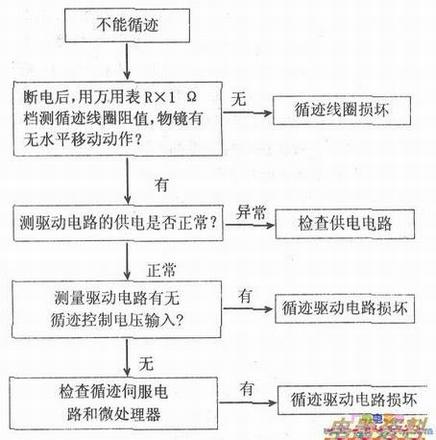 这种情况也是平时维修中较常见的一种故障,其原因多为激光头不良或循迹伺服不良。对于循迹伺服不良,在检修时可用R×1Ω档测量循迹线圈,阻值约为几欧,且物镜有水平方向的偏移运动,否则为循迹线圈断线。再检查循迹驱动是否损坏,可在循迹驱动电路的信号输入端加入干扰信号(可用R×1Ω档,一端接地,另一端触碰信号输入端),看激光头物镜有无径向动作?若无动作,则是循迹驱动电路损坏;若物镜有径向动作,则是RF信号处理电路输出的循迹误差信号(TE)异常或循迹伺服处理器有故障。