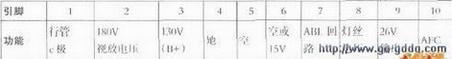 | 功能 | 行管 | 180V | 130V | 地 | -13V | 17V | ABL | 灯丝 | 空 | AFC |