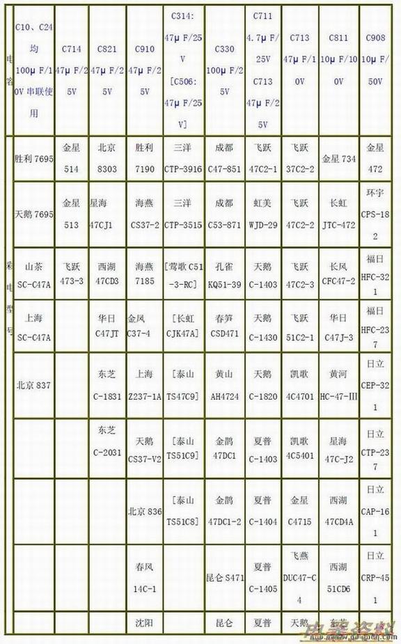 附表为一些常见彩电机芯造成开关电源输出电压升高的“关键”电容。