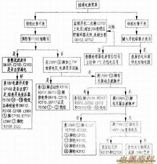 黑屏无声故障快速检修流程如下图所示。