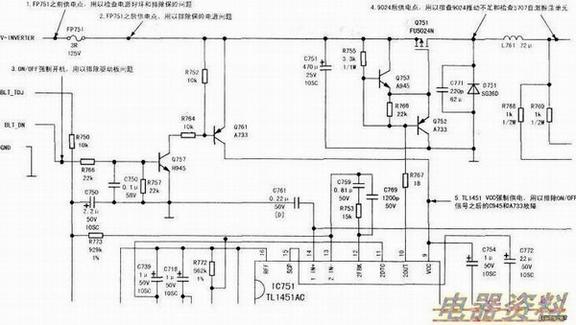 在维修中,如果遇到ON/OFF信号正常,+12V供电正常。但背光不工作的情况,可以采取对TLl415直接供电的方法来排查。即不使用ON/OFF信号,直接用+12V对9024和TL1451同时供电。如果此时背光正常工作。故障点就在反相三极管,即C945和A733上面;如果背光仍然不工作,就要考虑更换TL1451。