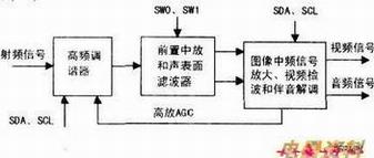 其图像公共通道电路有两种电路结构:一种为组合型结构,另一种为独立型结构。组合型结构指图像公共通道电路采用的是外观形似高频调谐器的组件。组件内部包括高频调谐器和图像中频信号处理两大部分(如右图所示)。组件正常工作的外部条件非常简单,只有电压+5V、调谐电压+33v、幅频特性选择控制信号SW0和SW1、总线信号SDA和SCL。习惯上将此组合型电路组成的器件仍称之为高频调谐器。只不过这时的高频调谐器输出的已不是图像中频信号,而是视频全电视信号和音频信号(或第二伴音中频)。若所维修彩电采用的是此类器件,故障现象为故障1,更换此组件即可故障排除。