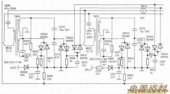 下图是一个液晶电视的部分截图,该部分常出现的问题是逆变器损坏。这个电路一共使用了四只逆变器,如何才能快速判断哪个逆变器出现故障呢?很简单,以T804为例,它的组成是由C900和T804的初级绕组串联的,是一个串联谐振回路。假如T804出现匝间短路,必然会引起增大降低的情况,那么电压会降在哪呢?会降在C900两端。因此,我们判断是不是T804出现短路只需要测量C900两端的交流电压就可以了。经过验证,正常时C900两端的压降为5V~7V,T804出现匝间短路时,C900两端的压降可达20V~25V。