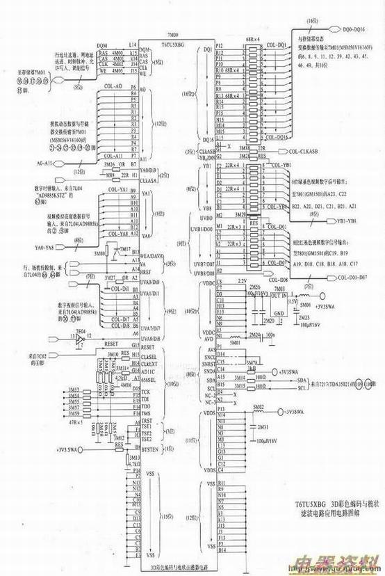 对于3D电路7MOO(T6TU5XBG)电路及其外围相关电路的检查,可参照下图应用图解进行。检查方法与要点按花屏、干扰、马赛克故障方法即可。