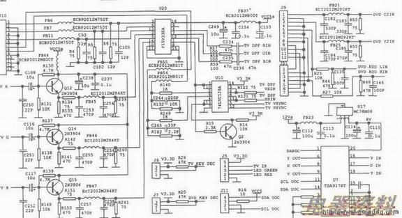 该故障通常会导致电视机出现无图像、图像异常、行不同步、场不同步、屏幕显示异常、彩色异常等现象。相关电路见下图、中图、下图,如果遇到图像信号切换电路故障时,先分别检测Ul0(9)、(10)脚(DPF送来的行,场同步信号),(12)、(5)脚(TV/AWSVHS送来的行,场同步信号)输入的行,场同步信号是否正常。如果异常则检查FB55、R149、FB54、R140等是否存在开路,或检查DPF及U2(67)、(22)脚输出的行,场同步信号是否正常。如果异常则检查DPF电路、U2电路及外围元件是否存在故障等。后检测Ul0(3)、(8)、(6)、(11)脚输出的行,场同步信号是否正常。如果异常则检查u1o(1)、(10)、(4)、(13)脚的控制是否正常。