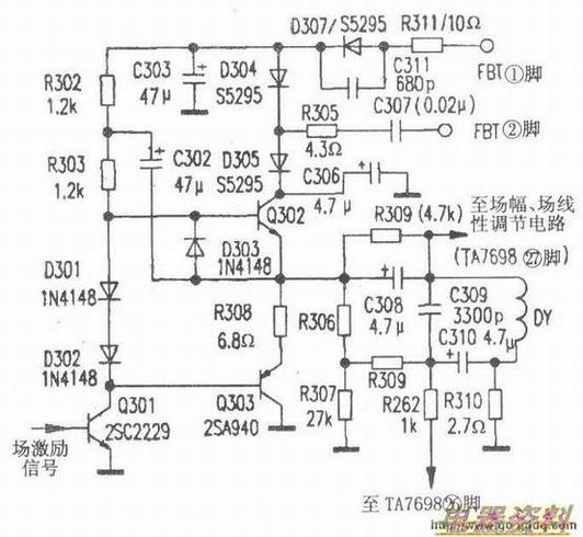 导致场锯齿波线性不良。例如在下图典型的OTL分立元件场输出电路中,C310为交流负反馈。它失容或不良将会使光栅上方压缩,且场幅不足。图1中R308为直流负反馈,改变R306、R307的阻值比,可改变负反馈量大小。若R308开路或阻值变大,将会使场线性变坏,并出现场幅过大故障。R309为场正反馈线性补偿,以保证场扫描线性良好。当它阻值过大或开路后,会使场线性变差。