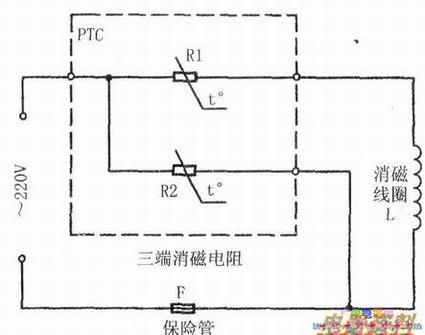 强调指出的是:由于Rl与R2的特性与作用不同,因此在使用和代换三端PTC时不能不加分辨地随意乱接端子,否则后果难料。轻则消磁效果明显下降甚至起不到消磁作用,重则造成自身损坏失效或危及安全。另外,对于三端消磁电阻不能用两只二端PTC代换,因为从工作原理上讲,仅用两只二端PTC无论如何连接也不能实现三端PTC的功能。更严重的是,二端PTC的额定电阻值很低,两只二端PTC电阻同时由电网提供电流,开机瞬间的冲击电流会远远超过原设计消磁电路的起始电流值,常会熔断保险丝。在三端PTC失效而一时难找直接代换元件时,应急状态下的权宜之计是暂时用一只标称值相同的二端消磁电阻接入Rl的位置,使机器先恢复使用。决不能将二端PTC接入R2的位置,以防不测。