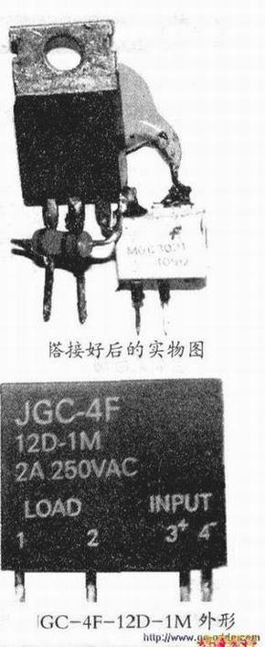该模块一旦损坏,很难购买到相同型号的配件更换。通过原理分析,完全可以用一些常用的、比较容易购买的元件自制来进行代换。首先选取一只4A—8A的双向可控硅,比如常见的BT136、BT137、BT138,一只可控硅输出型(也可采用电流输出型、功率输出型、输出型)的光电耦合器,常见的有MOC3009、MOC3011、MOC3012、MOC3020、MOC3021、MOC3023、MOC3033等, 一只330n~lkΩ和一只O.OlμF~0.03μF,然后按上图所示电路图进行搭接好后(简称小板,搭接好后的实物图参见中图),接入相应的脚位上即可。比如用该电路来代换JGC-4F-12D-1M型光耦可控硅(外形图参见下图),将DIY小板的(1)脚接原来模块的直流供电输入端,即JGC-4F的(3)脚原电路;(2)脚接原JGC-4F的④脚电路;(4)脚接原来JGC -4F的(1)脚电路;(5)脚接JFC-4F的(2)脚原电路。只要按照电路图上面标注的一一对应连接无误后,即可正常运行。其中上图中的C是用来防止可控硅被误触发的抗干扰,该电容耐压值不低于250V,容量可在O.OlμF~0.03μF范围内选择。