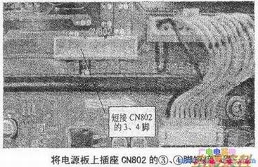 ①断开主板与PDP面板的连接,将板上插座CN802的③、④脚短接(即把CN802的④脚POWERON/OFF接地),该脚信号来自主板MCU输出的待机控制信号,短路该脚相当于用户按下“开/关机”键,如下图所示。