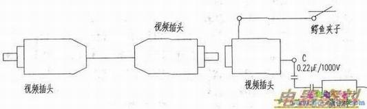 实现的办法就是做一个如下图所示的附件。取一段能插到电视机视频插口两端带有同样视频插头的导线一根,另外再拿一个视频插口,其接地的一端上一根带有鳄鱼夹子的导线,另一端(通信号的那一端)焊接上一只0.2211/1000V的器C,此器的另一端焊上带有测试棒的导线。