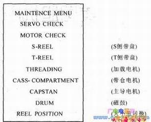 3)按↓移动到MOTOR CHECK按→进入如下图所示。电机页面先进入THREADING(加载电机),使其卸载,然后利用S侧或T侧带盘电机将溢出的磁带收回盒内,再进入CASS-COMPARTMENT(带仓电机)页面,安全退出磁带。如果上述某一项功能不能通过,就对那一项进行检查维修。
