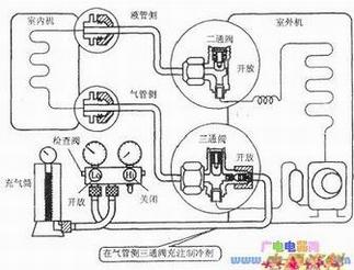 气管侧、液管侧均为三通截止阀的空调器,其充注制冷剂的管线连接方法如下图所示。