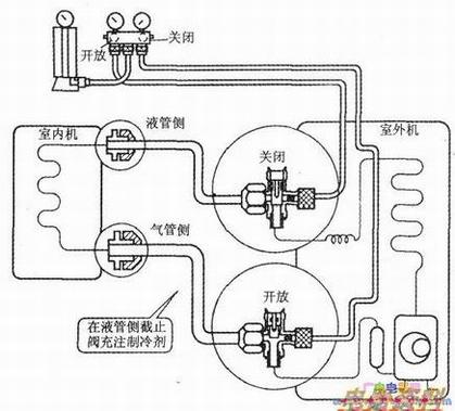 系统在抽真空后,还要重新充注制冷剂。对于液管侧为二通截止阀的空调器,充注制冷剂的方法如下图所示。