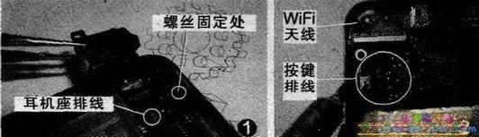 右下角的3.5mm耳机插座是用一颗螺丝固定着的,不能硬撬,拧下这颗螺丝后,先挑开与主板相连的排线,再用镊子把插座尾部向上撬,这样3.5mm耳机插座就取下来了(图2)。