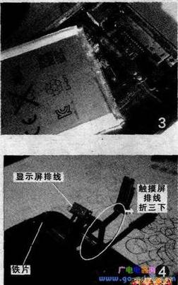 接下来要把触摸屏的排线折成三折,这是一个非常关键的步骤。如果触摸屏排线只折成两折就安装屏幕的话,会有多出的部分排线被电磁屏蔽罩卡住,多数情况下会造成屏部分面积触摸失灵。仔细观察触摸排线的前端部分,排线上有三块较硬的塑料片,顺着它们之间较软的排线部分把它们折成三折,其中最下面的一折要用双面胶固定在先前粘贴的铁片上,这样当屏幕扣上的时候排线就不会被电磁屏蔽罩边缘死死压住,当然也不会出现触摸失灵的故障了(图4)。