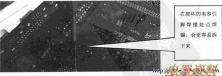 用电烙铁将损坏的电容一个一个拆下,如下图所示。拆完了换上相同容量的电容,在换上电容的时候要注意正、负极,不能装反。