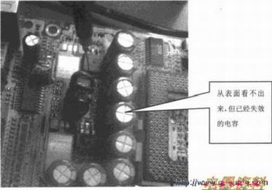 有的电容从表面看起来没有损坏,但用检测时,发现容量变小或已消失,再也不能使用了,如下图所示为通过检测发现容量已经消失的电容,此时换上相同容量的电容一股就正常了。