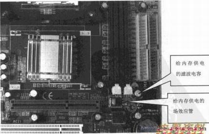 内存供电不正常也会引起死机,可以测量内存插槽的电压是否达到标准值(DDR为2.5V,SDRAM为3.3V),这种情况一般通过更换给内存供电的场效应管都能恢复正常。另外内存供电电容失效,造成输出电压不平稳也会引起死机。这种情况靠测电压是测不出来的,可以替换滤波电容,看问题能否解决。下图所示为给内存供电的场效应管和滤波电容。