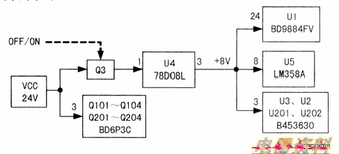 逆变器要正常工作,首先各、三极管等工作电压要正常。如三星LTA320WT-Ll6屏中的逆变器。在该逆变器中,来白电源板的+24V电压送入逆变器(VIT75001.50(后分两路(见图):一路直接为Q101-Q104、Q201~Q2O4供电:另一路经U4(78DO8L)稳压后形成+8V电压,该电压受CPU的开/关信号控制,当CPU输出高时Q3导通,+24V电压送入U4,经U4稳压后输出+8V电压送往U5、Ul~U2、U201~U2O2。维修时,可先测量各、三极管的工作电压,根据电压可很快找到故障部位。
