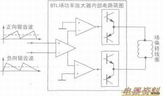 近年来,许多电视厂家采用效率高、线性好且无输出的OCL、BTL场功率放大电路,即直流耦合输出。其中,OCL电路采用正、负供电,如TDA8177、STV9379、LA78040等;BTL场功率放大电路前级采用差分输入,后级采用桥式推挽输出,如下图所示,其常见IC有TDA8351、TSA8356等。