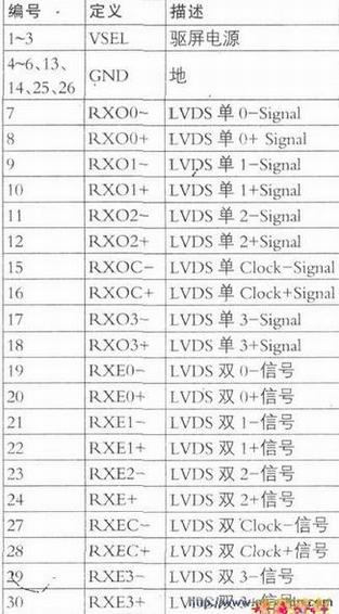 CN17为LVDS上屏线接口,左侧下排标有白色点的针为(1)脚,下排为(1)、(3)、(5)、(7)等奇数脚位,上排为(2)、(4)、(6)、(8)等偶数脚位,其引脚功能见下表。