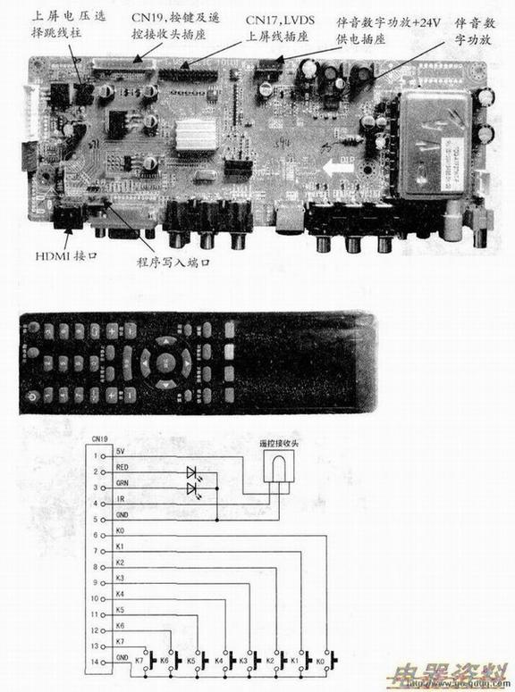 见上图,该板插座的背面均有引脚功能标注,按照标注接线即可。值得一起的是,CN12插座中“PWON”为的开/待机控制端,高有效;CN3插座中“BLO”为背光灯驱动板(即高压板或逆变板)的开/关控制端,高电平有效;“ADJ”为背光灯亮度调节端。按键及遥控信号输入插座CN19中的按键及遥控接收头的接法如下图所示,按键的另一端全接地,改装非常方便。其中,K0或K6可用于开机。