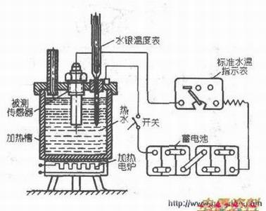 接通点火开关,用导线将其传感器接线柱搭铁,着此时水温表指针指向“H”,则表明水温表良好。也可将被检查的传感器装进正在加热的水槽中(如下图所示)。并与标准的水温表相串联,然后接入。当开关接通后,将水槽中的水分别加热至40℃或lOO℃时此水温由插入水槽中的标准水银温度计测量).保温3min左右。若观察到与标准传感器串联的水温表指示值也为40℃或lOO℃,则说明被测传感器无问题。检查水温传感器,拆下水温传感器的接线,用测量传感器与搭铁之间的电阻值,若电阻值为150Ω左右,则传感器为良好。检查水温表的电阻,用测量各终端之间的电阻值,若电阻值不符合标准要求,则应更换水温表。