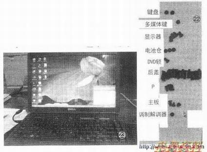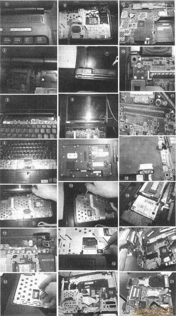 到此为止,机器基本上就全部拆开了.其余小件如风扇、视频板、SIM卡座、WLAN卡、按键等都一览无余了,只要稍细心点拆装都是没有问题的。另外想提醒一下初次拆笔记本电脑的朋友,最好还是慢点,把各部位拆下的螺丝依次做上标记(见图22).不但便于清楚装回去的顺序,还可以防止遗漏喔。