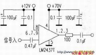 依据有二。一是原机所用的CVA1770M已坏了一块。另两块虽然还好,但已无法让彩显正常使用了,而LM24xx系列是三通道视频放大输出集成块。可以-一块顶三块CVA1770M;二是LM24xx系列集成块外围电路简洁。所用元件少。很方便代换。正好手上有块LM2437T,经试用,代换成功。代换方法很简单,按电路图将原来三块CVAl770M的信号输入、输出及引脚切断,再用跳线接到LM2437T相应的引脚上即可(见下图)。LM2437T可安装在原来的散热片上,如在代换后屏幕上有干扰。可在LM2437T两组引脚串入,电解尽量接近LM2437T两组电源引脚。