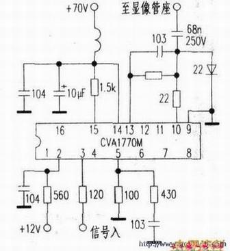 其工作原理是:M52749FP将电脑主机传送来的信号处理后输出三基色信号分别提供给三块CVAl770M,再由CVA1170M放大后驱动显像管的阴极。经检查发现有一块CVAl770M已经损坏。经剖析该集成块的外围电路见上图,决定用常见的LM24~x系列三通道视频放大输出集成块来代换。