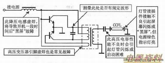 因为冷阴极荧光灯没有灯丝,其损坏与否不能凭简单的“测量法”进行判断,只有将其接于正常的逆变电路上,通过观察其发光状况才能确认其好坏。