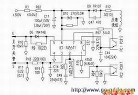 打开机壳检查F13(15A保险)烧断,开关管Q3K1686,检查其他元件无明显损坏现象(局部见附图所示)。更换损坏的元件,用手动调压器将输出调整到75V左右给该机供电,但不能启动,用表检测1⑤脚无电压输出,⑥脚工作电压为0V,判断IC1FA5511已损坏。但市场无法购到FA5511块,只能找到FA5311电源块,试着用FA5311代换,加电压后⑥脚电压在9V~15V之间波动,⑤脚无输出电压,电源不能进入工作状态。根据印刷电路板走向绘出FA5511的电路图和查到FA5311的电路图比较,其电路的走向基本一样。而电路中元件的数值有区别,说明FA5311和FA5511工作的和一些参数不同,不能直接代换。于是根据FA5311工作参数将电路的部分元件调整后,调压器仍调到70V左右电压,开机加电测量+5V。+12V,+39V各端电压已有输出。继续调高输入电压到220V.输出电压稳定。将各路输出都带上假后试机3小时,工作正常,说明代换成功。实际元件改动的数值见图所示,括号内为FA5311集成块工作的元件值,不带括号的为FA5511集成块的工作元件值。