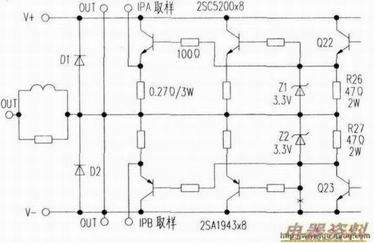 改装前要确定MOs管管脚排列2SK427管脚排列功能与A1943/C5200一致,可直接安装。大功率电阻不动,G极电阻原为470Ω,装三极管后改为100Ω,也可短接。原OUT—G之间的保护稳压值为12V,现改为3.3V.接法改正见下图。