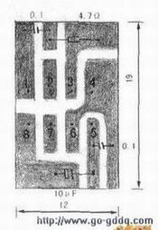TDA2822工作于BTL功放状态(见上图)。其印刷板如右图所示。所有安装在印刷电路板上的元件都采用超小型元件(元件总高度不要超过5mm)。