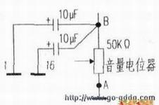 拆了CD1622CB后的(1)、(16)脚原为音频左、右声道的输入端,现用2只lOμF超小型电解分别从原(1)、(16)脚的位置上连接于50kn音量电位器的B点上(这2只器可安装在收音机的空余位置上),并用导线连接。