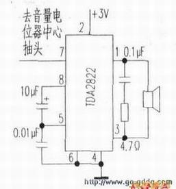 C38为220μF的电解电容,是只并接在该机3V两端的电容器。电位器的A点接地点和组装好的TDA2822功放部件的接地点均可接在C38的负极上,TDA2822(2)脚接C38正极上;(7)脚接音量电位器中心抽头;(1)、(3)脚接机内喇叭。接好线后,不需调试,开机一切正常。当音量开到最大时,测试整机为lOOmA左右。