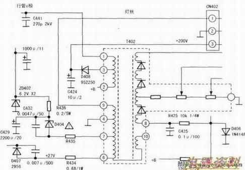 上门开壳检查。原型号为IF0101—0101,板上ABE,电路R425(10kΩ)、R341(120kΩ)、R321(100kΩ)均已烧毁,看来高压包是损坏无疑。此机是飞利浦机芯,与早期的TCL9328系列机芯几乎一模一样。其高压包损坏率较高,在高压包损坏的同时常伴随着ABL电路的R425、R341、R321烧毁,甚至集成块304(TDA3504)损坏。高压包IF0101-0101不难配,决定试用其他高压包改装。