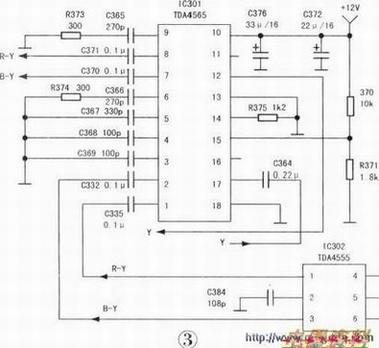 仔细查看原机线路图(见图1)。原高压包引脚功能如表1。参考现有的高压包引脚功能,决定用海信TC2918D的高压包BSC-N2420A来代换。海信TC2918D的高压包线路原理图及引脚功能分别见图2和表2。对比之下基本上无需大的改动。代换高压包并更换R425、R341、R321、D305后试机,呈水平亮线。又查得场输出集成块IC401(TDA3654)烧裂,更换后再试机,出现满屏白光。根据经验,高压包损坏的同时IC304(TDA3504)很可能损坏。于是代换IC304后试机,图像终于出现了,但全部是黑白图像。开机实测有关色度处理IC301(TDA4565)(10)脚和IC302(TDA4555)(13)脚供电脚均为10.5v。高压包(6)脚输出整流后的电压为+32V,比原机+27V偏高,(7)脚输出整流后的电压为+13v,比原机+15v偏低。决定先把电压恢复正常。(6)脚输出整流后的电压偏高5v,决定减少高压包的线圈匝数。在高压包的磁芯上用绝缘良好的导线绕了5圈,然后与(6)脚反方向串联后再整流,实测电压降至+27V。(7)脚输出整流后的电压偏低2V,试将原(7)脚外限流电阻R436由8.2Ω改为2.7Ω,实测ZD402的负端升至+12V,但试机仍无彩色出现。复查有关色度处理,测得IC301(10)脚和IC302(13)脚电压都升至+12V。正常。为了迅速缩小故障范围,如图3所示短接了IC301(1)脚R—Y输入和(8)脚R—Y输出、(2)脚B—Y输入和(7)脚B—Y输出、(17)脚Y输入和(12)脚输出后试机,彩色出现,但彩色。更换IC301后彩色恢复正常。再观察图像,发现行幅窄。调节行幅和枕校电位器VR402、VR403,效果不理想。最后在逆程C411(0.01μF/1600V)两端并联了一只472的后,行幅恢复正常。