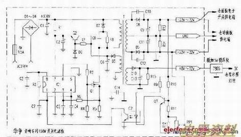 某功放的环形变压器因过热烧毁,已看不清标称,且无线路图,只能根据观察判断各项参数。该变压器次级共有6根输出线,其中有三根线接到功放板上,经整流后为功放提供正负电压。观察功放板上有两只10000μF/50V的电解担任。估计供电电压不会高于士40V。另外三根线接到前面板上,其中有一根线接显示屏灯丝端为灯丝供电(估计电压有6V左右),另一根线经半波整流及100μF/35V电解滤波后为显示屏及电子开关电路供电(估计电压有+30V左右。这一点和常见的-30V供电不同),剩下的那根线为公用接地线。 笔者选用“华争牌音响专用150W开关板”进行代换。该输出的主电压能从±22V到±32V调整,还有一路8—12V的副电压备用。代换时,首先拆除原机变压器,将开关电源上的主电压输出端与功放板的供电端对应相连。然后从开关电源的主电压输出正端接一引线连至面板显示屏及电子开关电路的供电端。最后从开关电源的副电压输出端经一只5V稳压块7805稳压后接到显示屏灯丝供电端(见附图)。因原机面板上有与前置电路相连的地线,故可不接地线。以防自激。