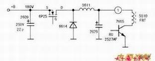 通电后测行营BU2527AF集电极只有20V左右,而+B180V正常,调整管6P25发烫。为了方便检修,绘出相关见图。把(1)脚掏空,串入表,在500型表500mA挡指针快速超量程。拆下行管测量,正常,高压包各功能端子对地没有明显的短路。用1OOW灯泡并在2629两端后通电,灯亮,电压为85V,说明供电正常,怀疑高压包交流短路。该机高压包型号为LCECP2091。购一只型号为HO213的启朝牌高压包代换后故障排除,此时手摸6P25几乎无温升。