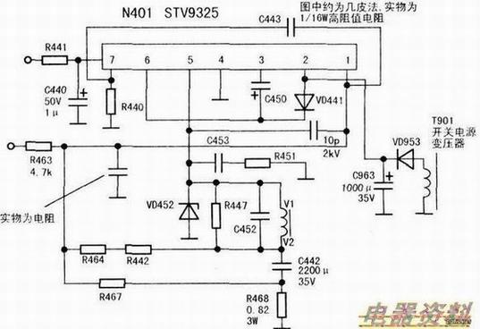 分析N401损坏是因T402异常放电引起的,T402必坏无疑。用700W调温风枪把丁402拆下,用华声牌1239#康佳/BSC28-0643代换,将N401、VD452拆除,通电,不再放电,屏幕出现一条水平亮线,几秒后自动关机,按“频道”键可重新开机。测+B和场供电正常。由于购不到STV9325,决定用功能相近的其他型号代换,实绘STV9325应用如下图所示。