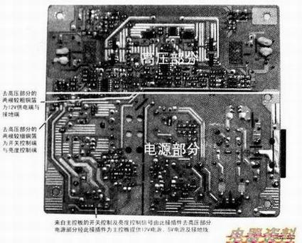 大多品牌机的部分与高压部分整合在一张板上,采用一体化设计,性能较好。二合一板损坏后,既可采用更换元件的方法维修,也可采用改制代换的方法维修。由于市售高压板价格比较低廉,敌建议采用独立高压板来整体代换原机高压部分进行维修。二合一板的机型内部空间有限,在安装独立高压板之前,可先裁去原机高压部分电路板,以便安装新高压板。如下图所示。
