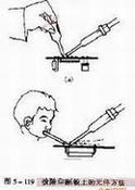 取一支钢笔,将钢笔笔帽、笔尖等卸下,仅留取笔杆。如果笔杆地下无小孔眼,可钻取一只φ1.5~2mm的小孔,作为“吹气筒”。用20W电烙铁将焊脚的焊锡化开,然后用“吹气筒”对准焊点用力吹气,即可将焊锡吹开,化锡一脚,全部管脚的焊锡吹开后,即可将这只多脚元件拔出印制线路板。
