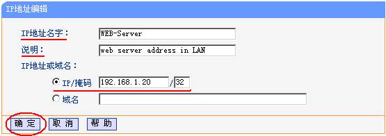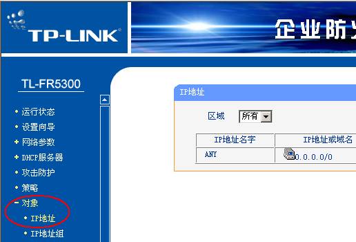 首先,在TL-FR5300配置界面选择“对象”-“IP地址”,然后在“IP地址”页面添加内网建立服务器的主机的IP地址。如下图所示: